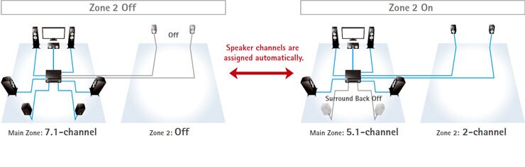 HDMI zone switching offers the ability to individually select and send HD video programmes to two separate zones. Watch a Blu-ray Disc™ movie in the Main Zone while an HD cable TV broadcast plays in another room (Zone 2).