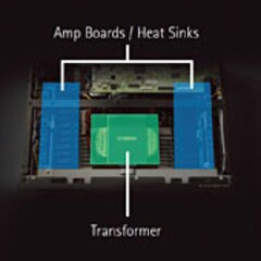 The interior of the receiver is reinforced with cross members in an H shape to provide an extremely rigid and stable frame. This reduces chassis vibration to virtually zero even during high volume output (seemingly minor vibrations can affect the sound), maintaining the highest audio quality.