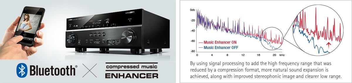 This AV receiver is equipped with Bluetooth functionality to let you enjoy easy wireless music playback from smartphones and other devices. The Compressed Music Enhancer from Yamaha is now optimised for Bluetooth audio transmissions to ensure that your music will have vivid, lively sound quality during wireless playback.