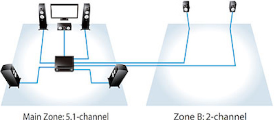 Zone B output capability allows the receiver to send 2-channel sound to a second zone, so the main zone now has 5-channel output. This means that users can enjoy stereo sound in a second room. The same source will play in both zones (cannot use two sources).