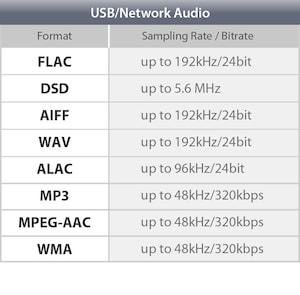 - DSD 2.8MHz/5.6MHz, FLAC/WAV/AIFF 192kHz/24bit, Apple Lossless 96kHz / 24-bit playback