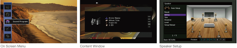 Yamaha’ s latest Graphical User Interface has a high resolution display with clear, easy-to-use menus and also includes a selectable Status Bar that shows input source, volume level, DSP mode and audio format. The GUI provides a choice of eight languages: English, French, German, Spanish, Italian, Russian, Japanese and Chinese, and can be displayed over both normal and 3D pictures.