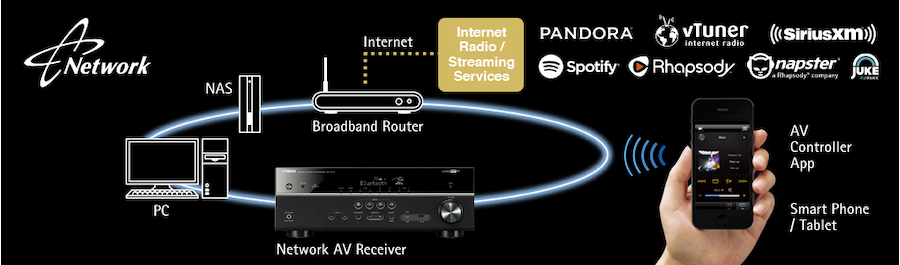 This AV receiver provides a variety of network functions that enable you to access more sources and also enhance operation. You can connect the receiver to your home network or internet to enjoy Internet Radio, Spotify*, Pandora®*, JUKE*, Napster®*, Rhapsody®*, SiriusXM* or music stored on a NAS and home PC. The AV Controller app (from iTunes App Store or Google play) lets you control various functions from your iPod, iPhone, iPad or Android phones / tablets.