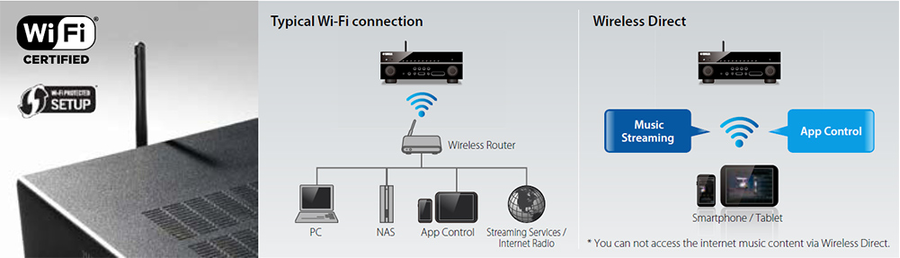 Wi-Fi Built-in capability allows wireless connection with your household wireless router, greatly simplifying system connections to enjoy network audio and music streaming services. If no Wi-Fi router is available, the unique Wireless Direct feature not only allows you to stream music directly from your smartphone or tablet via AV Controller App's Music Play feature, iOS's AirPlay etc, but also control your receiver using the AV Controller app.