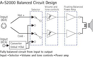 The A-S2000 achieves fully balanced signal transmission from input to output (balanced design refers to the use of two signal