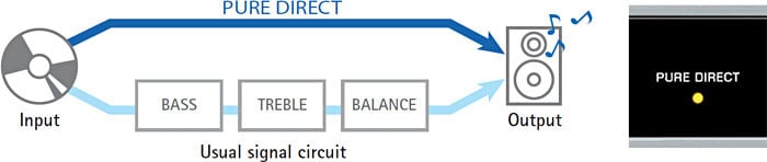 Engaging the Pure Direct Switch causes the audio signal to bypass the control circuits for bass and treble, balance and the back buffer amp. This improves sound quality while maintaining full output capacity. Shortening the signal route improves sound purity, helping to reproduce even the most delicate musical nuances.