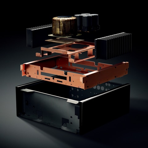 De expressie van diepe, ritmische en melodieuze lage tonen geeft de muziek gevoel en vertelt het bijbehorende verhaal. Het mechanische-aardingsconcept zorgt ervoor dat deze expressieve en ritmische lage tonen optimaal worden weergegeven door maximalisering van de stijfheid en vermindering van ongewenste trillingen. De grote transformator, de blokcondensatoren en het koellichaam zijn rechtstreeks op het chassis bevestigd voor een grotere stijfheid, terwijl de voetjes rechtstreeks met bouten op het hoofdchassis zijn gelast voor absolute stijfheid. De stijve, gestroomlijnde constructie van de A-S3200 zorgt dat trillingen nog verder worden onderdrukt.