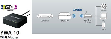 The CD-N301 provide provide a DC-out connection for the YWA-10 WiFi Adapter (optional accessory). This lets you stream music wirelessly via a router from network components such as a PC or NAS. The YWA-10 gets its power from the CD-N301’s USB terminal on rear panel, and offers WPS (auto setup) or manual setup via PC.