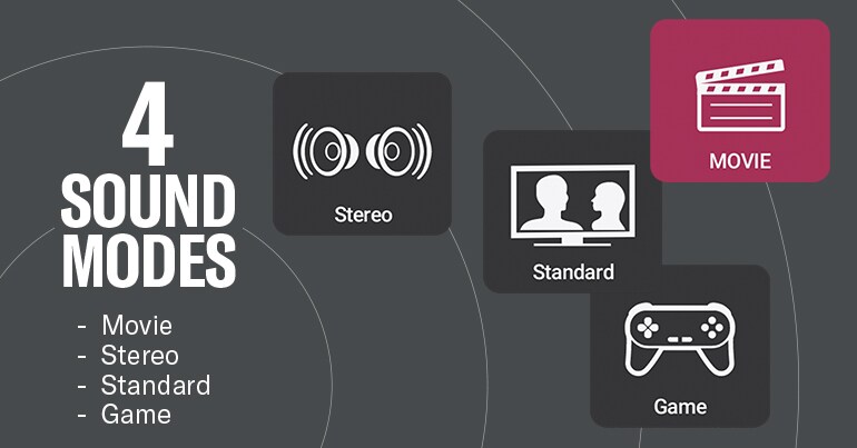 Met vier verschillende geluidsmodi kun je het geluid afstemmen op het soort entertainment en je stemming. De stereomodus is ideaal voor muziek en podcasts en de standaardmodus is perfect voor tv-programma's. In de gamemodus ga je helemaal op in de actie en met de filmmodus creëer je een overweldigende bioscoopervaring.