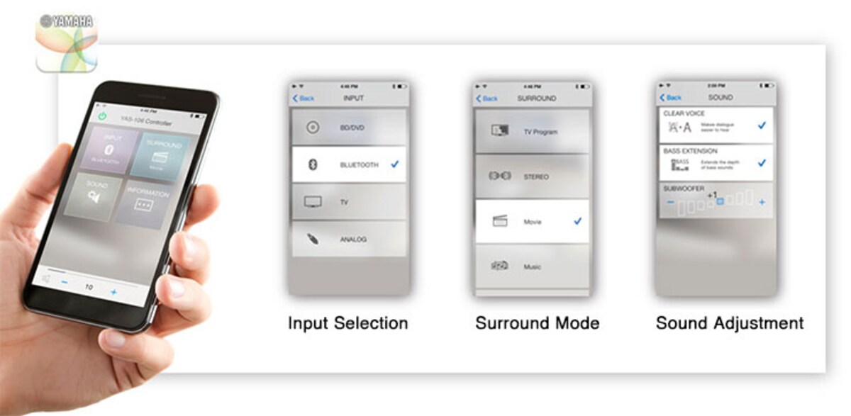The YAS-106 is compatible with a free controller app for iOS and Android. The easy-to-see and easy-to- use operating screen uses icons to let you easily perform a variety of operations while watching your smartphone or tablet screen. You can also select five surround modes: Movie, Sports, Game, Music, TV programme.