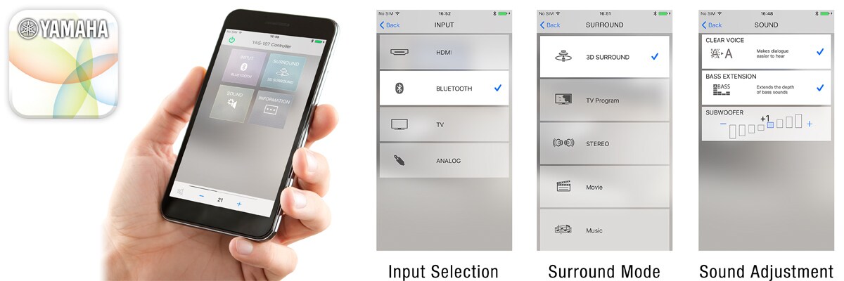 When watching a movie at night, have you ever worried about the sound disturbing others? The YAS-107 can put your mind at ease. It’s got an independent volume control for the bass — which passes more easily through walls — right on the remote or the special app.