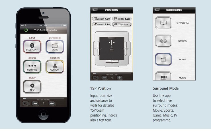 The YSP-1400 is compatible with a free controller app (HT Controller) for iOS and Android. The easyto-see and easy-to-use operating screen uses icons to let you easily perform a variety of operations while watching your smartphone or tablet screen. You can also make detailed settings for the beam sound output.