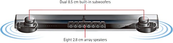 This single body soundbar has eight array speakers in the centre and subwoofers in the stands at both ends. With a built-in 76 W digital amplifier to power the speakers, it produces sound with exceptional power and presence.
