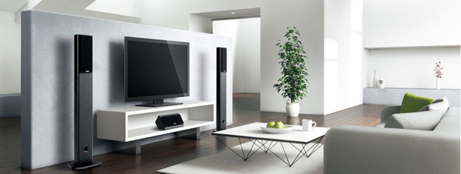 The NS-F120 has an elegantly flat shape, measuring only 9.6cm (3-3/4”) deep. This makes it a perfect match for flat-screen TVs. Place one on each side of the TV for a stylish system that looks great in any room.