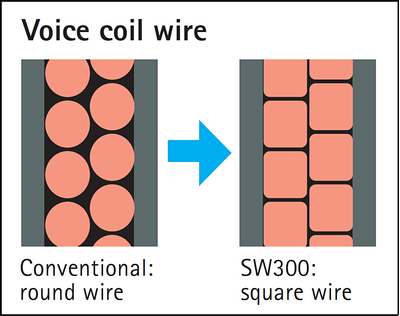 A 25 cm (10”) large woofer unit is used in a front-firing configuration. The voice coil of the driver unit employs square wire with a wide surface area that can be wound more densely to obtain higher magnetic flux density. It delivers high drive force, permitting tight and deep bass reproduction.