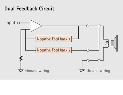 The built-in power amplifier delivers stable power output of 250 W with high efficiency while minimizing power consumption and heat production. It does not require an output filter coil, resulting in extremely low noise and distortion. High speed transient response is also excellent. The dual feedback circuit reduces distortion by applying feedback twice, resulting in higher sound clarity.