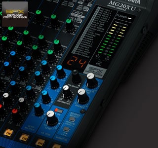 Voor zowel muzikale als niet-muzikale toepassingen voegt effectverwerking polijsting en professionaliteit toe aan de mix. De MG X / XU-modellen zijn voorzien van Yamaha's veelgeprezen SPX digitale multi-effectprocessor, die een uitgebreid pakket van 24 bewerkbare digitale effecten biedt, perfect voor het verbeteren van uw mix, of u nu diepte toevoegt aan een spreekbeurt of nieuwe kleur en sfeer ademt in een live bandoptreden. Met name de hoogwaardige reverb en delay vergroten de ruimtelijke kwaliteit van het geluid met opmerkelijk realisme en natuurlijkheid. U kunt zelfs een optionele FC5-voetschakelaar aansluiten om het effect aan / uit te regelen. (MG10X / 10XU / 10XUF / 12X / 12XU / 12XUK / 16X / 16XU / 20XU)