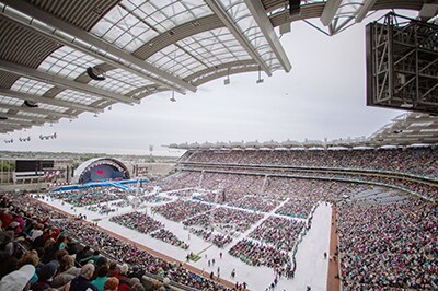 Ondanks dat het slechts 36 uur duurde, trok het eerste pauselijke bezoek aan de Republiek Ierland sinds 40 jaar, wereldwijd krantenkoppen en duizenden katholieken die in de aanwezigheid wilden zijn van Zijne Heiligheid, paus Franciscus. Dublins uitverkochte Croke Park-stadion vormde het decor voor het Festival of Families - het hoogtepunt van de driejaarlijkse, zesdaagse Wereldontmoetingsvergadering dagen van gezinnen - een groot live-evenement met een breed scala aan entertainment en de paus die zicht richtte tot de menigte van 82.500 personen. Een Yamaha RIVAGE PM7 digitaal mengsysteem werd het beheren en mixen van het FoH-geluid (Front of House) van het evenement toevertrouwd.