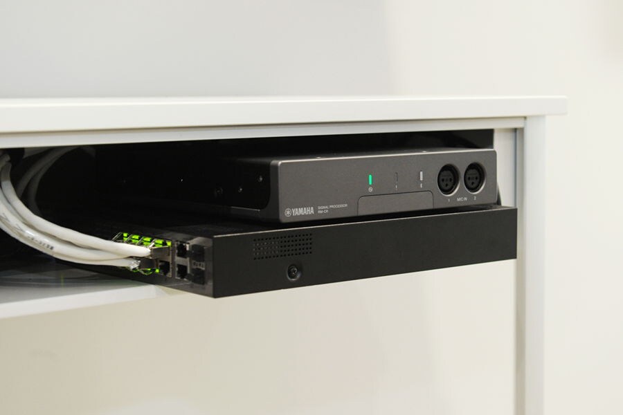 • RM-CR Remote Conference Processor and SWR2311P-10G L2 Switch installed on a shelf below the monitor (brought out for photography)
