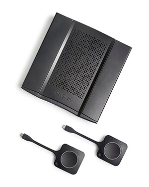 However, with ClickShare, you can simply connect the cable to the ClickShare Base Unit, and then simply insert the ClickShare button into your computer, so that you can have remote teleconferences using ADECIA immediately. In the first place, ADECIA's ceiling microphone offers the advantage of maintaining a tidy-looking table, so by combining it with ClickShare, you can create a completely wireless remote teleconferencing environment where there are no cables on the table at all.