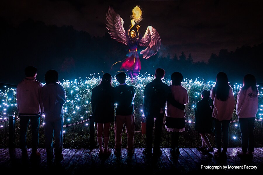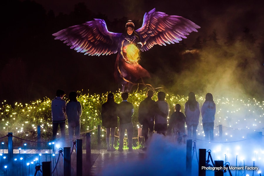 As visitors are ushered along winding paths, experiencing local tales about five different energy sources, water, wood, fire, metal and earth, the experience gives audiences a taste of a new entertainment format, connecting the mythology of the past with the technology of today.