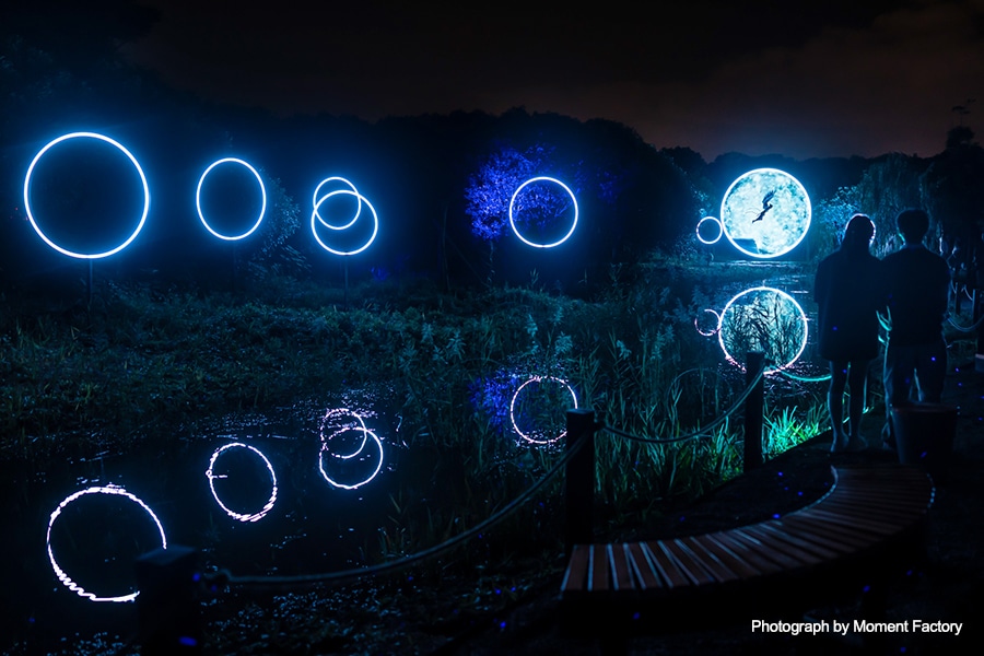 Oriens Lumina is situated in the grounds of the Nine Trees Future Art Centre, in Shanghai’s suburban Fengxian district. Inspired by elements of ancient Chinese mythology and old Fengxian traditions, an original storyline was developed in consultation with local experts. It has been brought to life by weaving sound, lighting, projection mapping and interactive elements together to highlight the natural surroundings, serving as a night time experience which complements events held at the art centre.