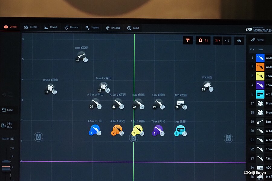 AFC Image treats each sound source as a moveable ‘object’. At the Takeo Moriyama Jazz Night, this meant when the saxophone soloist came to the front of the stage and moved around, Mr Toyoda moved the object on the AFC Image control tablet's touchscreen in real time, making the sound of the instrument follow the movement of the soloist.