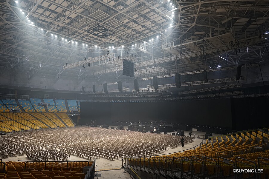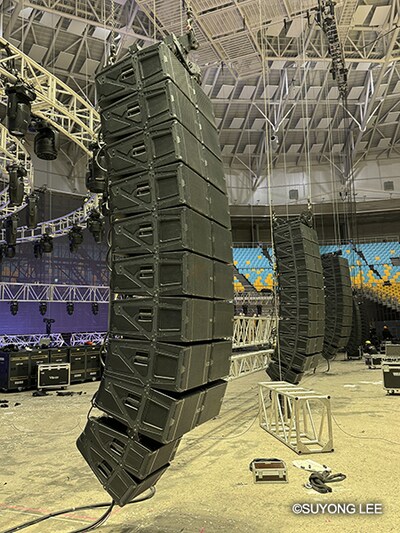 The event presented two main challenges. The first was that KSPO Dome is renowned for its challenging acoustics, thanks to it’s internal size, shape and long reverberation times. The second was that, in a large, circular space with the audience arranged at slightly more than 180º in front of the stage, using a conventional stereo PA meant it was difficult to control sound localization and, therefore, for listeners to perceive the position of each sound source as the Front of House engineer would intend.