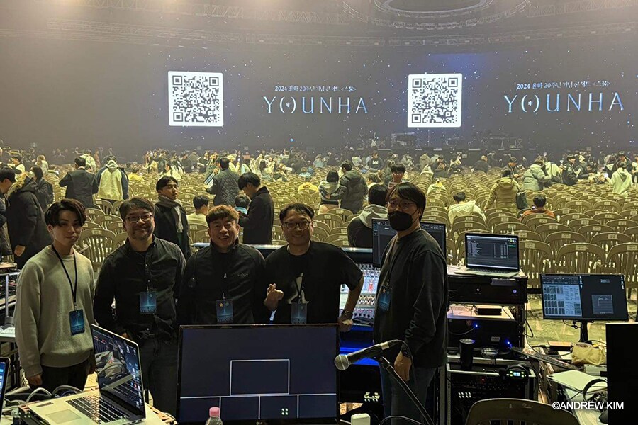 The performers comprised Younha on lead vocals, piano and guitar, accompanied by two more guitarists, two keyboard players, bass guitar, drums and two backing vocalists. According to Mr Lee, in previous concerts at the KSPO Dome the sound was indistinct, with sources sounding doubled. To deliver the experience that these special shows hoped for, a new solution was needed.