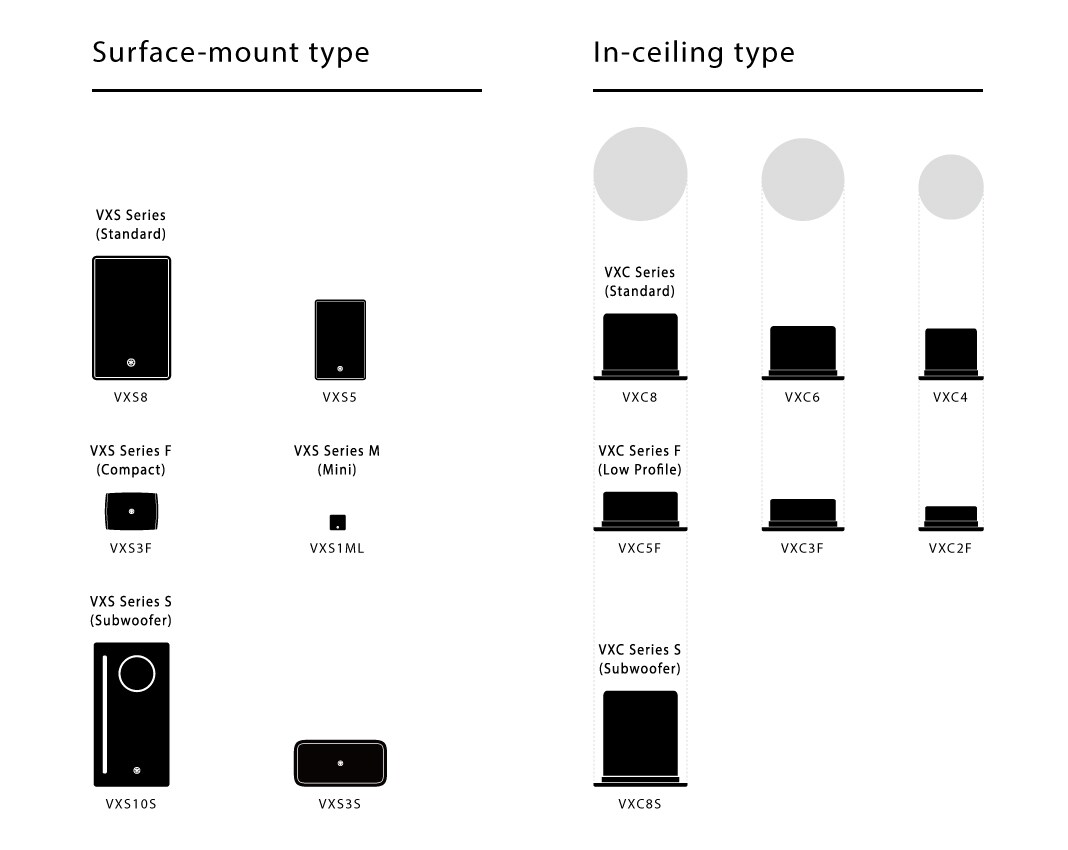 Ceiling SpeakersDe “S-modellen” uit de VXC-serie zijn subwoofers voor het plafond die een ideale aanvulling vormen op het expressieve, natuurlijke geluid van de luidsprekers uit de VXS- en VXC-serie zonder het interieurontwerp te verpesten.