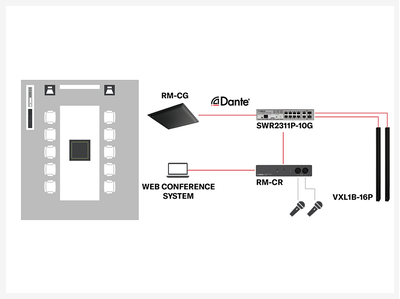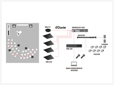 Its RM-CR conference processor offers two additional analogue microphone inputs. VXL1-16P speakers provide perfect audio output.