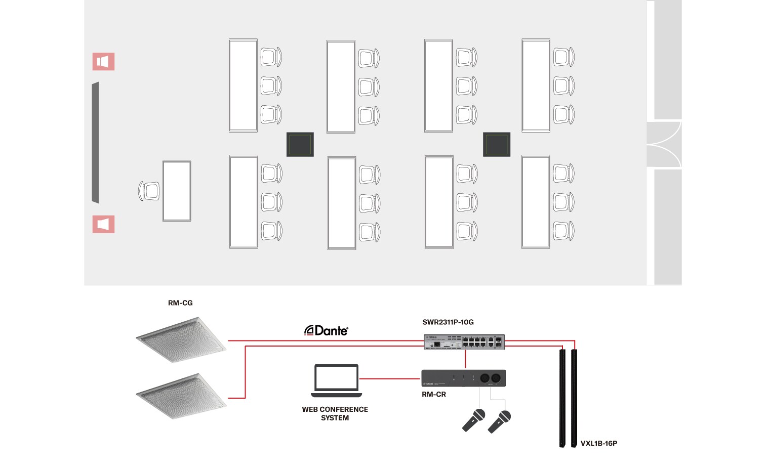 With two RM-CG ceiling Microphones you can cover 100m², the VXL1-16P speakers offer best sound for these kind of rooms and the RM-CR conference processor is doing the optimal parameter setting for all devices.