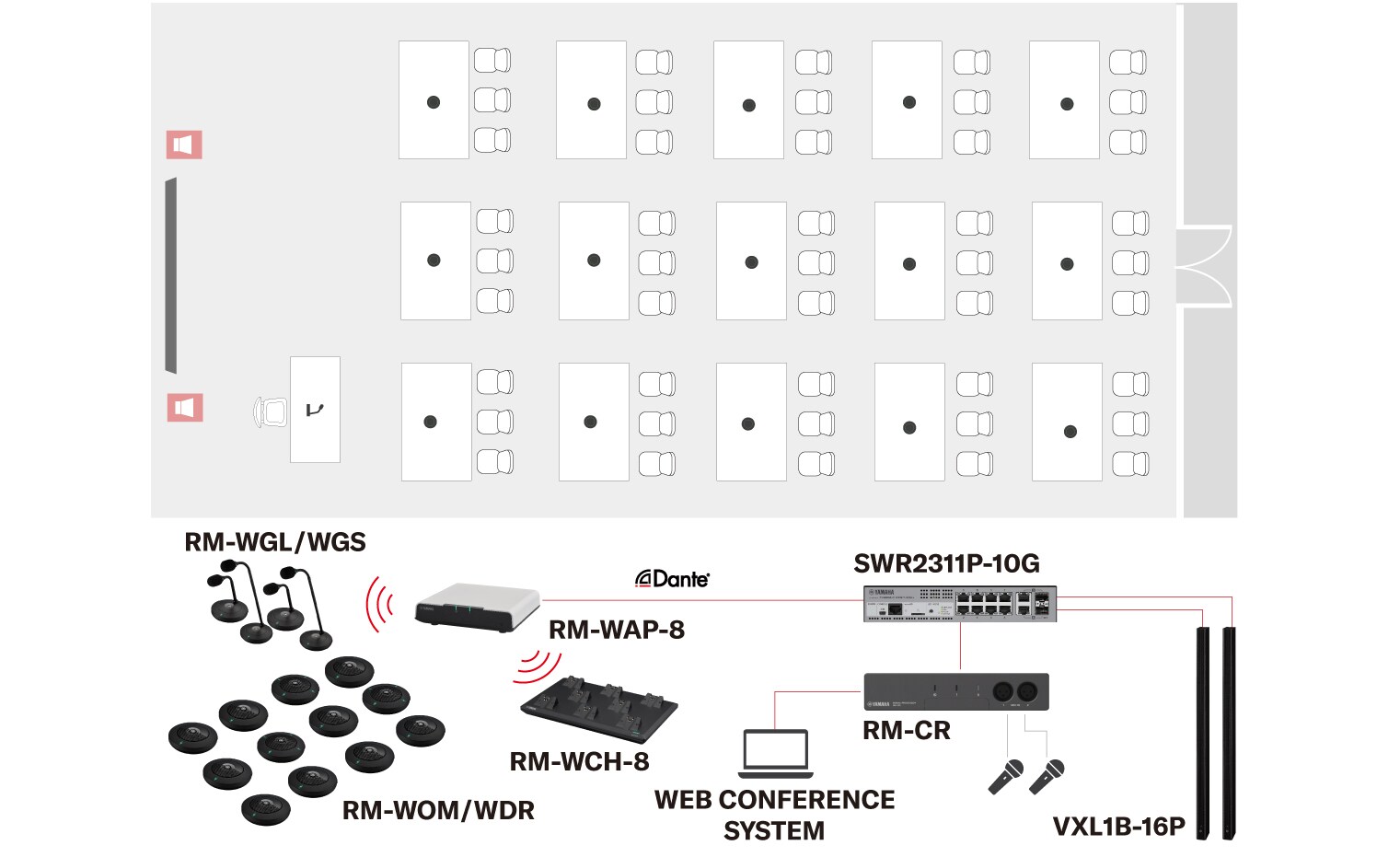 Since conference halls are set up in different ways, sometimes with very high ceilings or with different seating arrangements, with or without tables, a flexible and easy-to-integrate solution is needed. With ADECIA Wireless, 16 wireless microphones can be connected and distributed on tables or at the lectern. In addition, further analogue microphones can be connected to the RM-CR conference processor. The VXL1-16P loudspeakers then provide the sound. In this way, conferences can be broadcast anywhere.