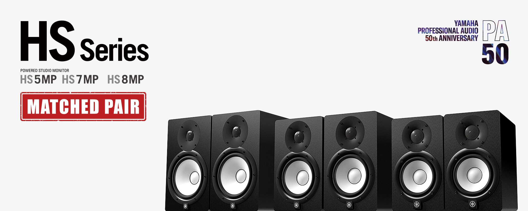 In 2019 vieren we het vijftigjarige jubileum van de PA-divisie en kwamen we op het idee om een speciaal model van de HS-serie te produceren dat nog meer aandacht zou krijgen van Yamaha-technici. De HS-serie belichaamt de ontwerpfilosofie waar Yamaha al lang op aandringt voor zijn studiomonitors, en is nu verkrijgbaar als een speciaal model met een op elkaar afgestemd paar dat geselecteerde onderdelen gebruikt. Het gepaarde model draagt de aanduiding MP (Matched Pair) en op de achterkant van elke unit zijn MP-stickers aangebracht. Tegelijkertijd vervaardigd en met gepaarde serienummers, worden de 'HS MP-modellen' door Yamaha aangeboden als een speciaal herinneringsmodel ter gelegenheid van het vijftigjarig jubileum. We zijn ervan overtuigd dat dit speciale paar stereomonitorluidsprekers een gewaardeerde rol zal spelen in uw opname-, mix- en masteringwerk.
