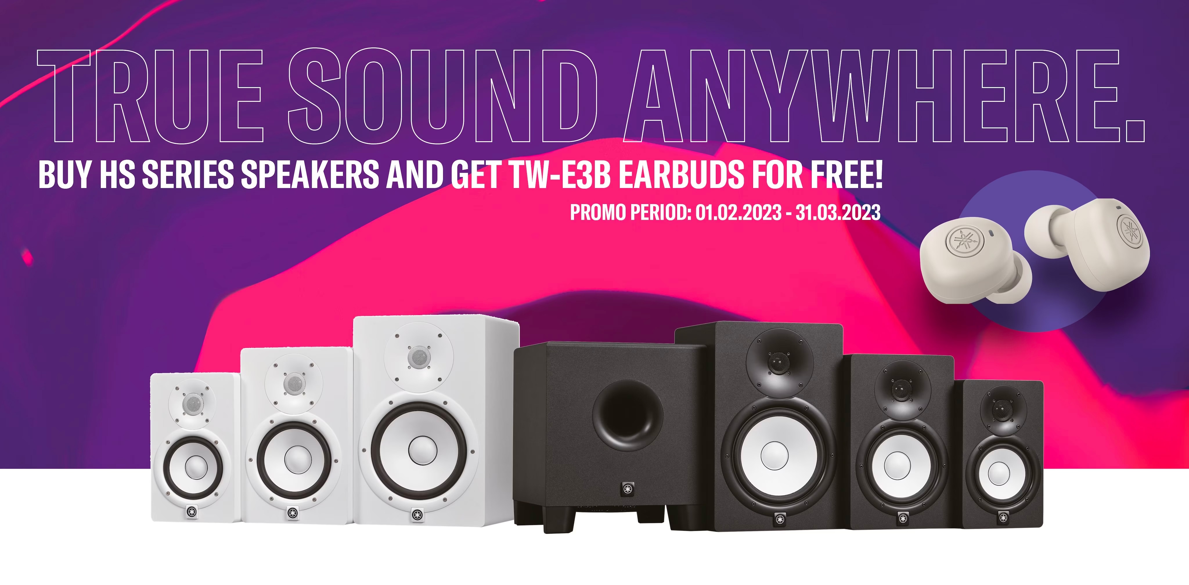 If you buy a pair of Yamaha HS series monitor speakers or a single HS8S subwoofer between February 1 and March 31, 2023, you can claim a free pair of TW-E3B earbuds.
