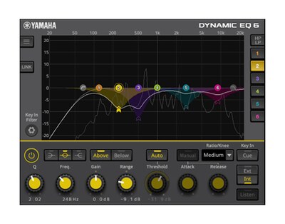 The Dynamic EQ6 is a six band dynamic equalizer, which includes an expanded feature set, combining static gain with the dynamic range control and adding high pass/low pass filters to the features of previous Yamaha Dynamic EQ plug-ins.
