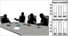 When two people speak at the same time the gain is equally distributed between the two active microphones so that the total gain remains constant, and the gain of the remaining microphone is lowered.