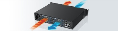 In addition to the main AC IN connector, an external +24V DC power source can be connected to an XLR-4-32 type EXT DC INPUT connector to serve as a backup for the primary internal power supply. The main AC input also features a latched socket (V-Lock) that helps to prevent accidental disconnection.