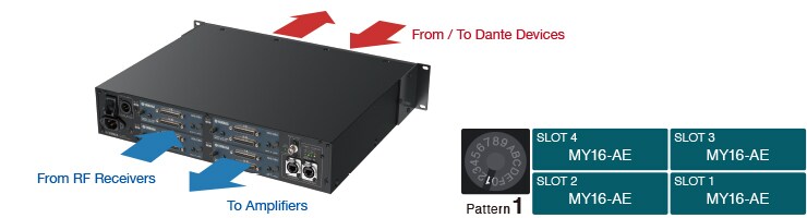 With four MY16-AE AES/EBU cards installed, the AES/EBU output from RF receivers can be converted to Dante format and fed to a CL or QL series console, while the Dante signal is converted to AES/EBU for connection to digital-input power amplifiers. Sample rate converters are provided for each of the RSio64-D slots, so devices operating on different word clocks can be connected without causing signal interruptions or increasing noise.