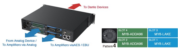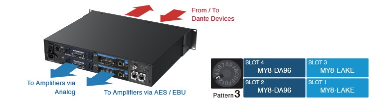 In this example MY8-LAKE processor cards are installed in slots 1 and 3 while MY8-DA96 cards are installed in slots 2 and 4. With this setup Dante input from a CL or QL series console can be fed to the MY8-LAKE cards and then simultaneously output via Dante, the AES/EBU outputs of the MY8-LAKE card, and the analog outputs of the MY8-DA96 card after processing.