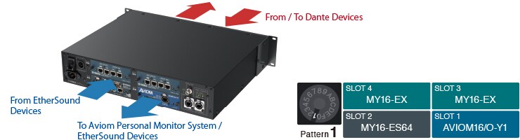 An AVIOM16/O-Y1 AVIOM card installed in slot 1 allows connection to a personal monitor system. If an MY16-ES64 EtherSound card is also installed in slot 2 while MY16-EX I/O expansion cards are installed in slots 3 and 4, it becomes possible to simultaneously convert between Dante and EtherSound. The sample rate converters provided for each RSio64-D slots allow Dante and EtherSound signals based on different word clocks to be connected without causing signal interruptions or increasing noise.