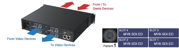 Four MY8-SDI-ED embed/de-embed cards can be installed in the RSio64-D slots to provide bi-directional conversion between Dante and HD-SDI/SD-SDI signals. The sample rate converters provided for each RSio64-D slots allow devices operating on different word clocks to be connected without causing signal interruptions or increasing noise.