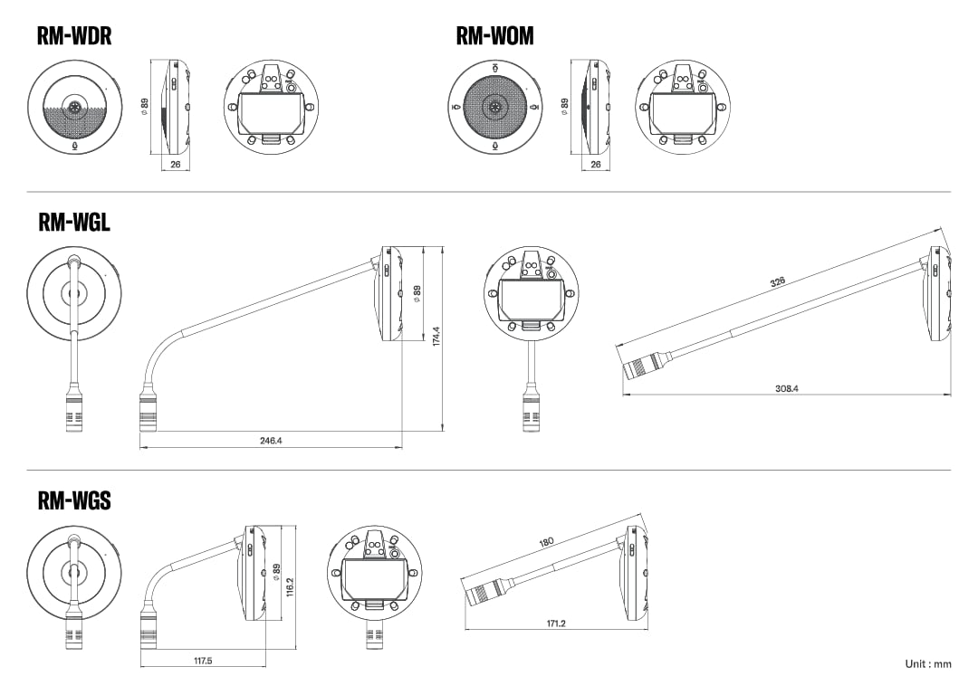 | General | Dimensions | W 171.2 mm x D 172.5 mm x H 42.8 mm | W 89.0 mm x D 89.0 mm x H 26.0 mm (including rubber feet) | W 89.0 mm x D 89.0 mm x H 26.0 mm (including rubber feet) | RM-WGL: W 89.0 mm x D 89.0 mm x H 308.4 mm (including rubber feet and to center of gooseneck mic), RM-WGS: W 89.0 mm x D 89.0 mm x H 171.2 mm (including rubber feet and to center of gooseneck mic) | W 304 mm x D 188 mm x H 41.5 mm (including rubber feet) | - | |