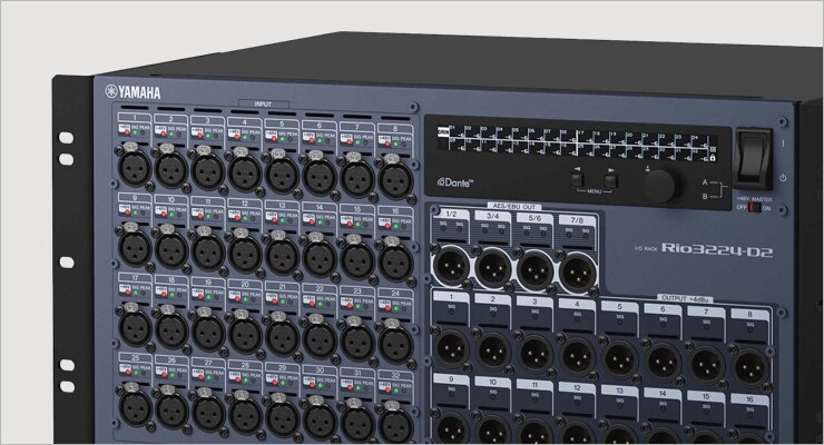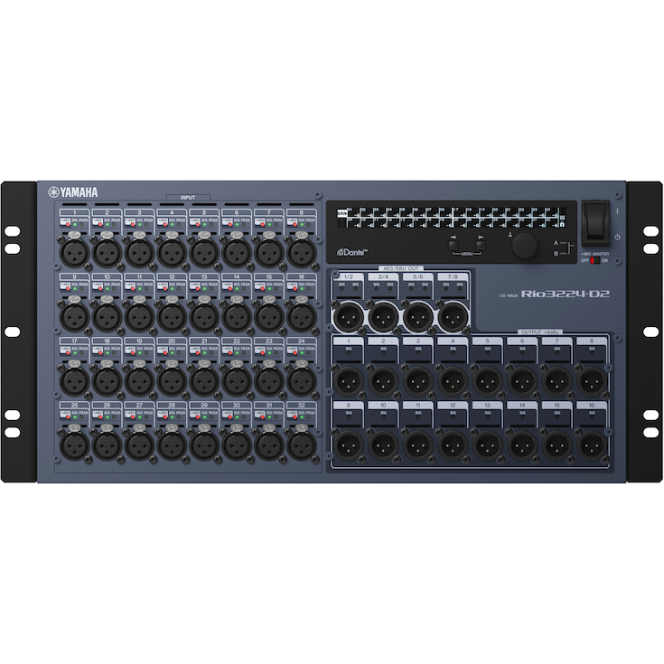 This high-capacity, high-performance I/O rack is compatible with Yamaha CL and QL series consoles as well as the RIVAGE PM series. It features 32 analog inputs, 16 analog outputs, and eight digital AES/EBU outputs. The Rio3224-D2 connects directly to Dante digital audio networks, allowing flexible system configuration. Dual power supply units are built in for high reliability, and a character/graphic display offers easy visual confirmation.