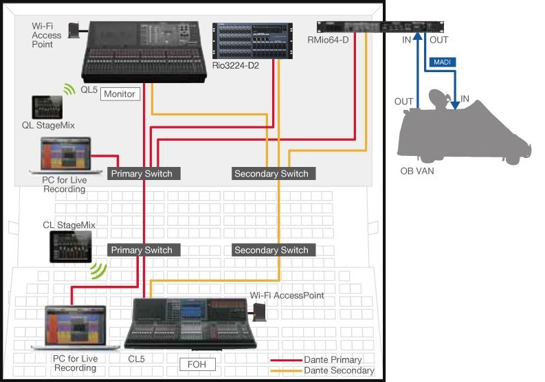 The RMio64-D converts the system’s Dante signal to MADI for transmission to the OB van outside the venue. Sample rate conversion built into the RMio64-D effectively resolves word clock synchronization issues.