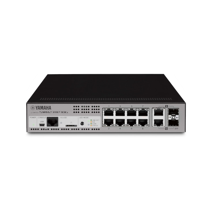 SWR2311P-10G is an intelligent L2 switch that can supply power to PoE powered devices on the network.Yamaha has integrated its own expertise in networking and professional audio fields and developed it as an L2 switch optimized for Dante audio networks.