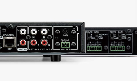 Lo-Z/Hi-Z switchable Class-D mixer amplifier (Lo-Z: 30W x2ch, Hi-Z: 60W x1ch) equipped with 3 types of selectable stereo inputs, 2 mic inputs and powerful DSP functions for high quality music playback and microphone use.