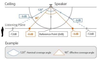 It is important to note that the nominal coverage angle listed in ceiling speaker specifications is not the same as the speaker’s actual effective coverage angle. SPL at the nominal coverage angle is 6dB lower than the on-axis SPL, measured at a constant distance from the speaker. The effective coverage angle is defined as the angle at which the SPL is 6dB lower than the on-axis SPL at the listening plane. The effective coverage angle is usually about 70~80% of the nominal coverage angle. CISSCA calculations are based on effective coverage angles.