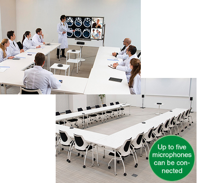 - Uitstekende schaalbare en flexibele oplossing voor grote vergaderruimten met speciale tafelconfiguraties, aansluitende serieschakeling tot 5 microfoons en ondersteuning voor 2 externe luidsprekers