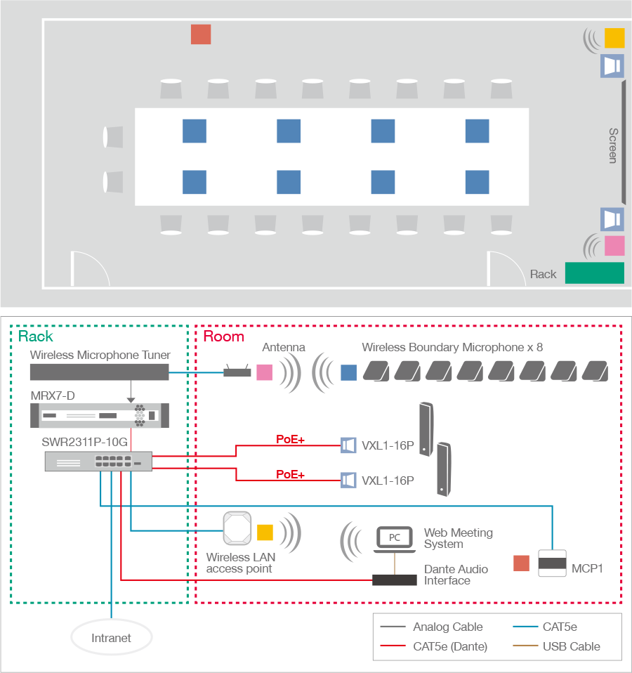 With audio distributed via a Dante network and PoE power* supplied from a PoE compliant L2 switch, the speaker system can be constructed as a network, allowing existing IT infrastructure to be effectively utilized. Simple wiring via LAN cables, easy installation, and no need for a power amp contribute to the flexibility of installation, allowing you to construct an elegant sound system that will not interfere with the design of the conference room.